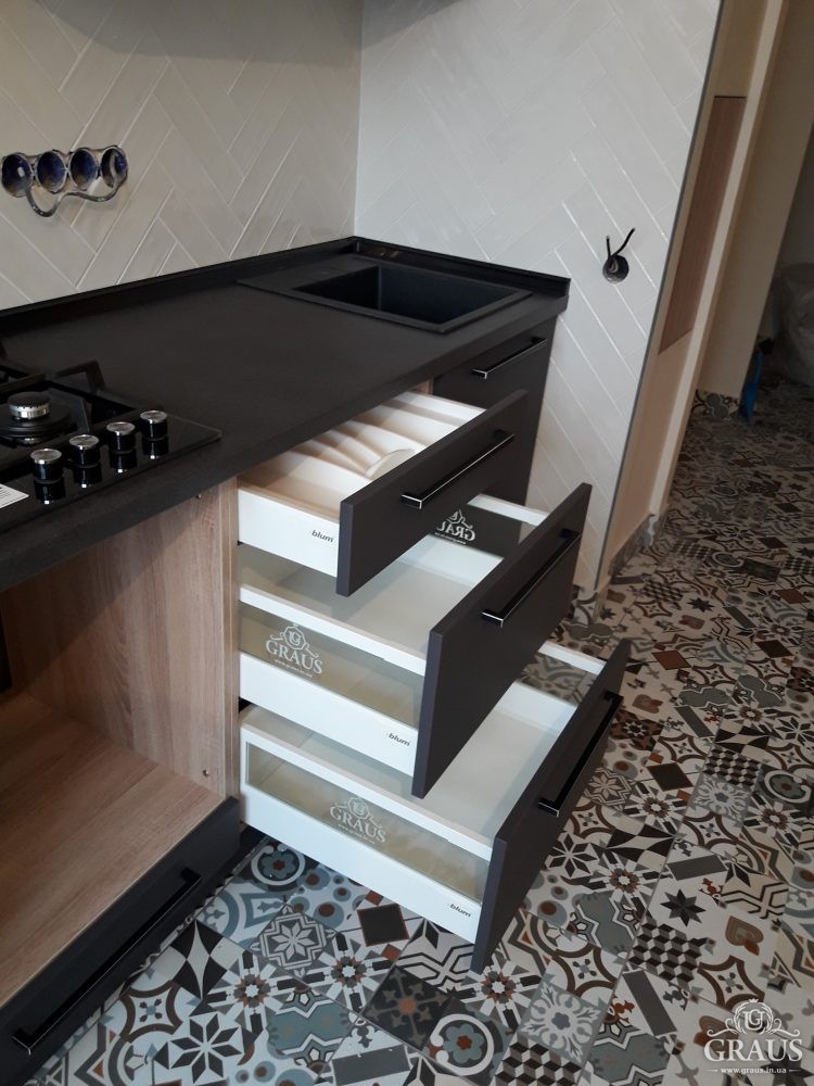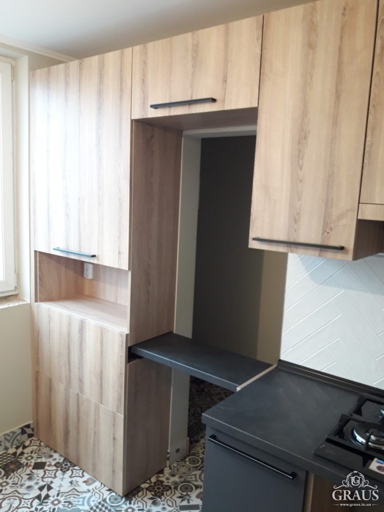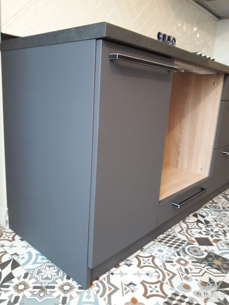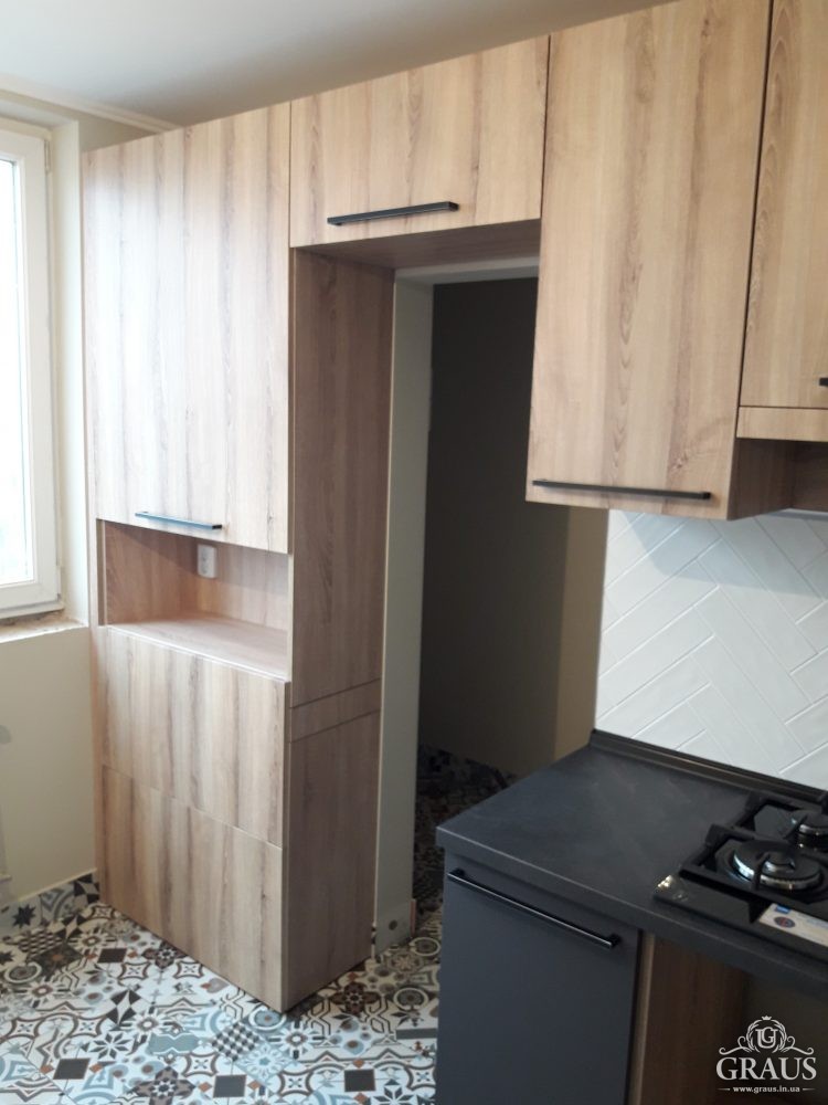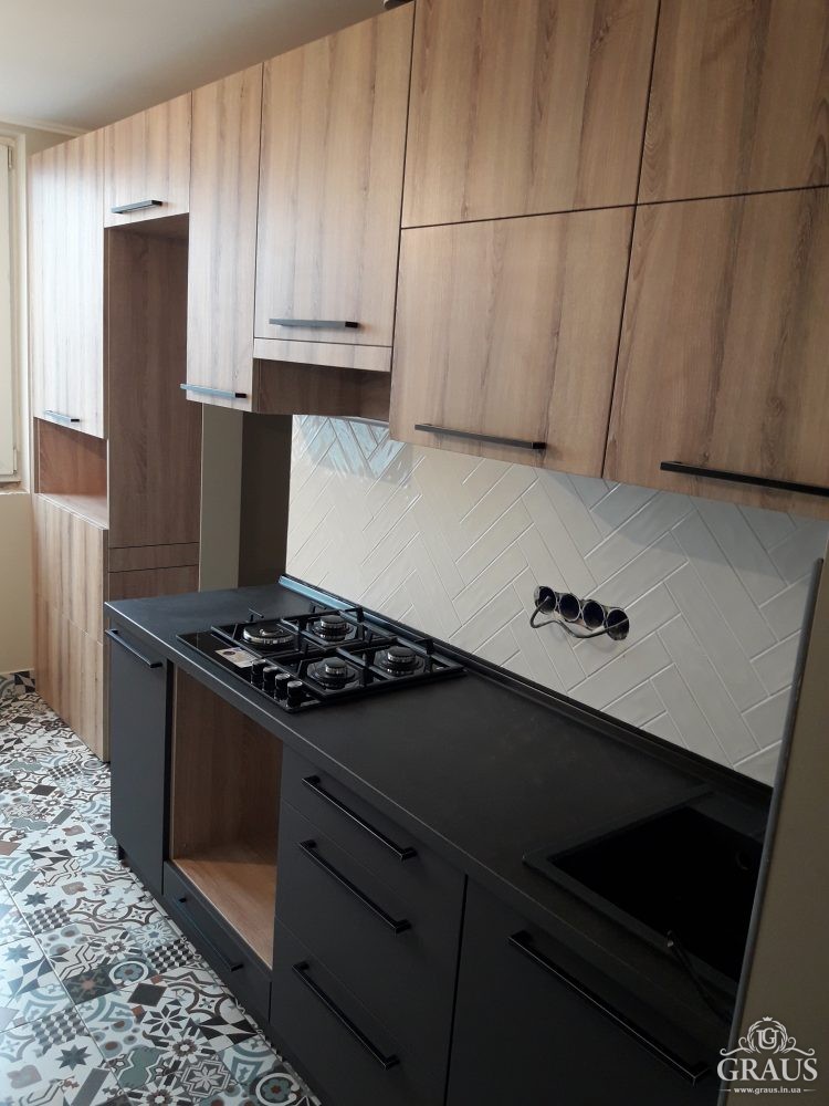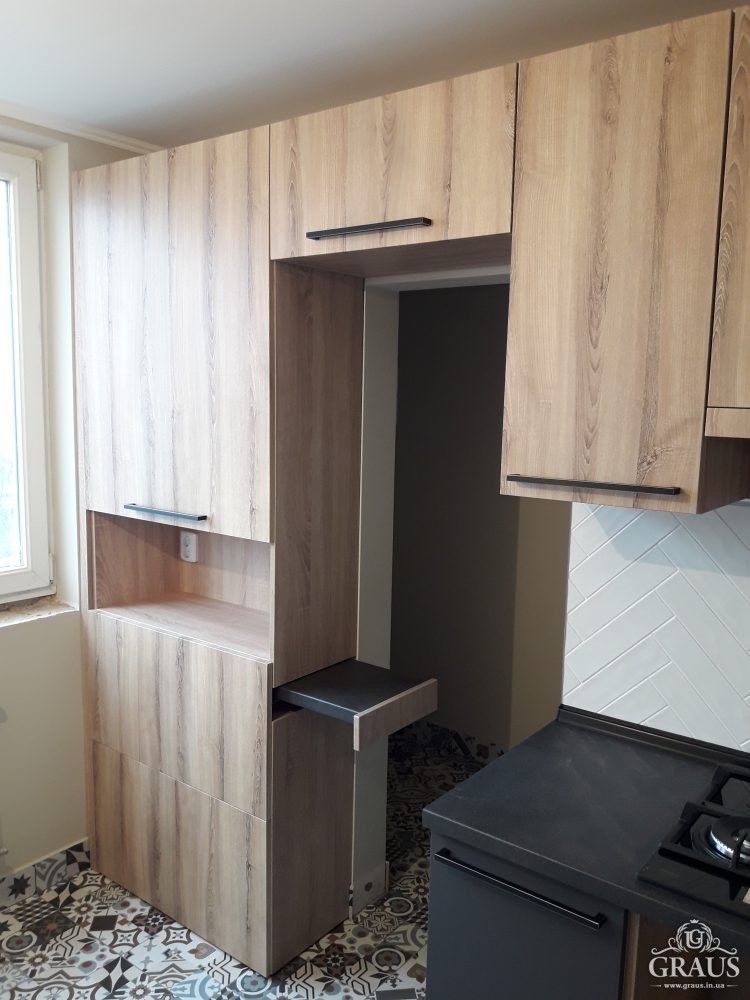 Фасад – МДФ пленочный, фурнитура Blum, Hettich, Muller. Столешница Бучина. Плинтус Rehau.