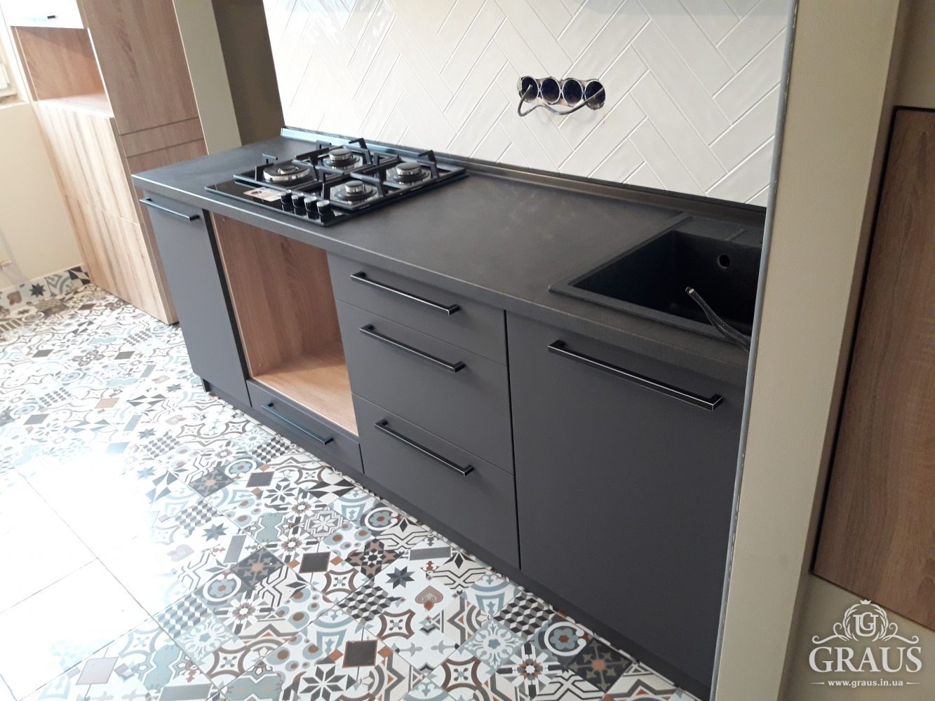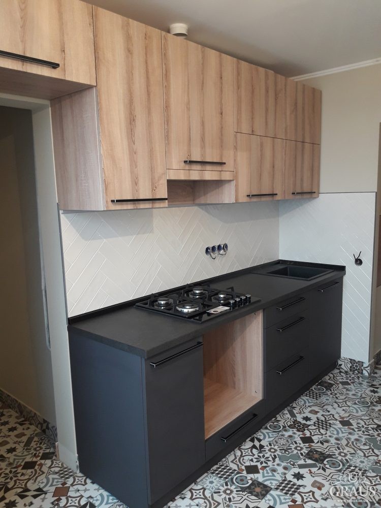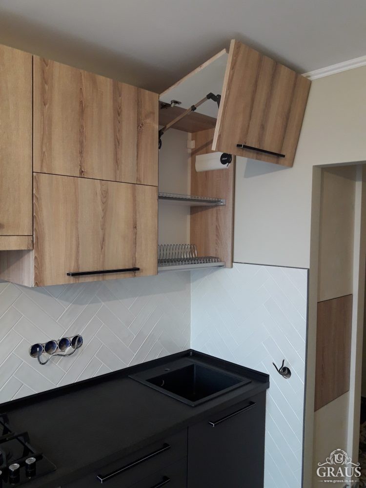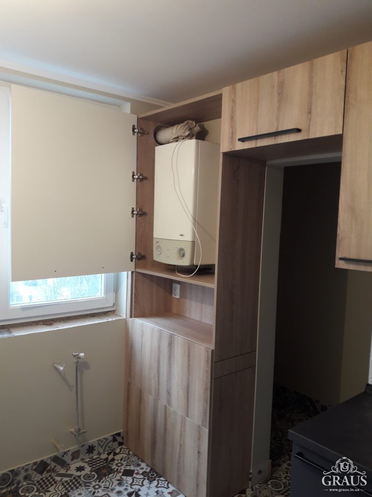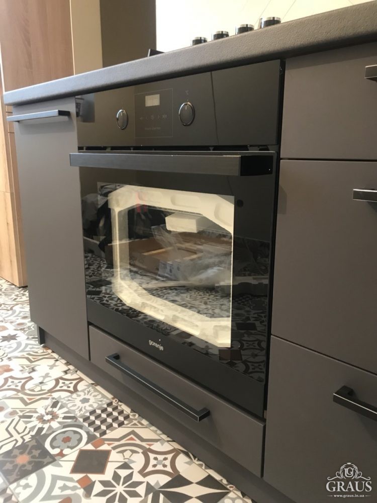 Фасад – МДФ пленочный, фурнитура Blum, Hettich, Muller. Столешница Бучина. Плинтус Rehau.