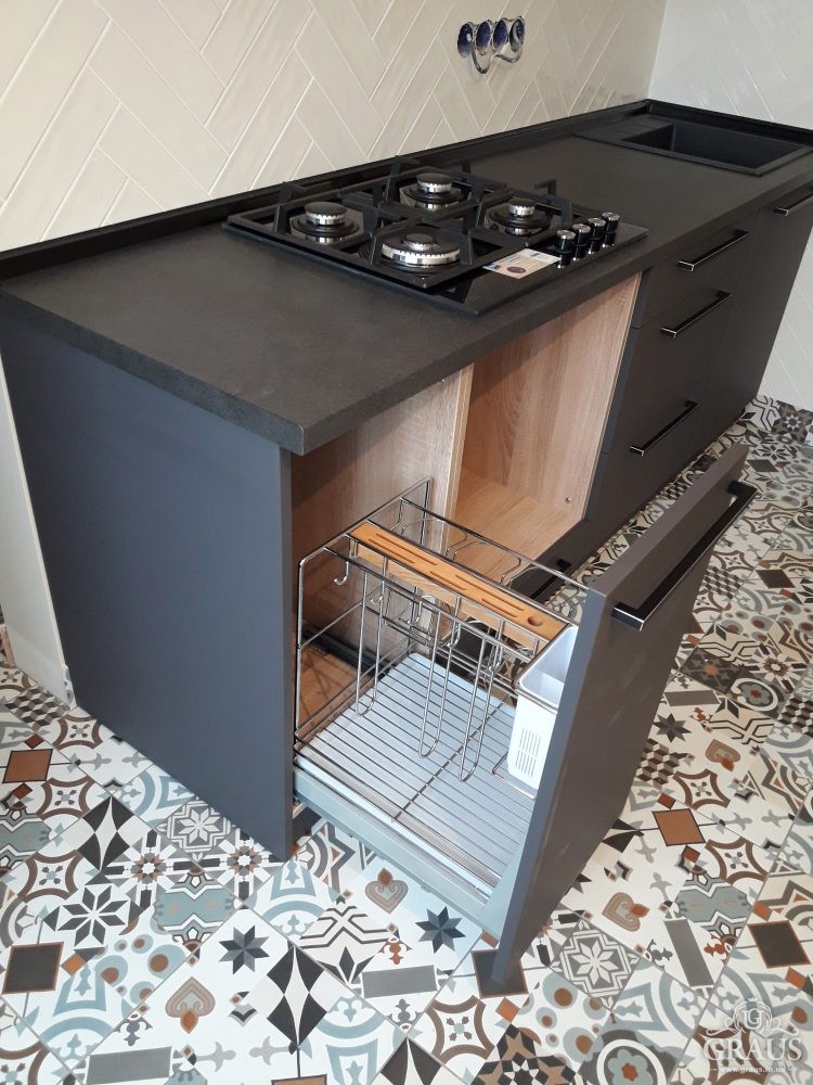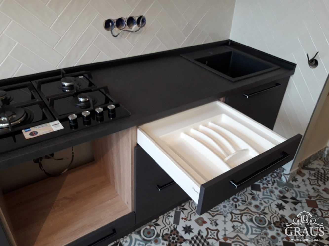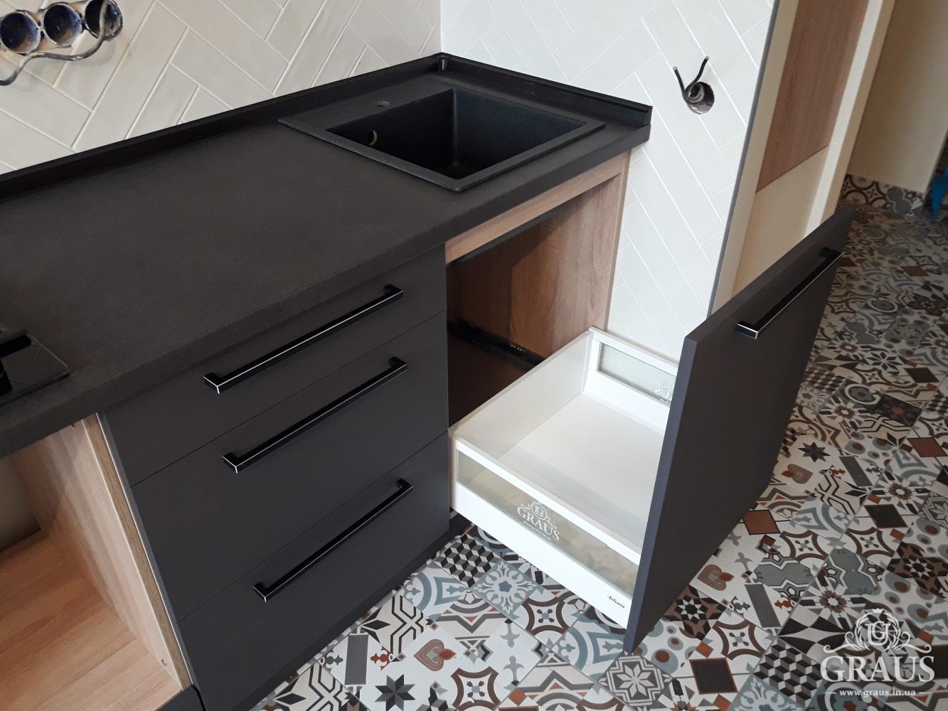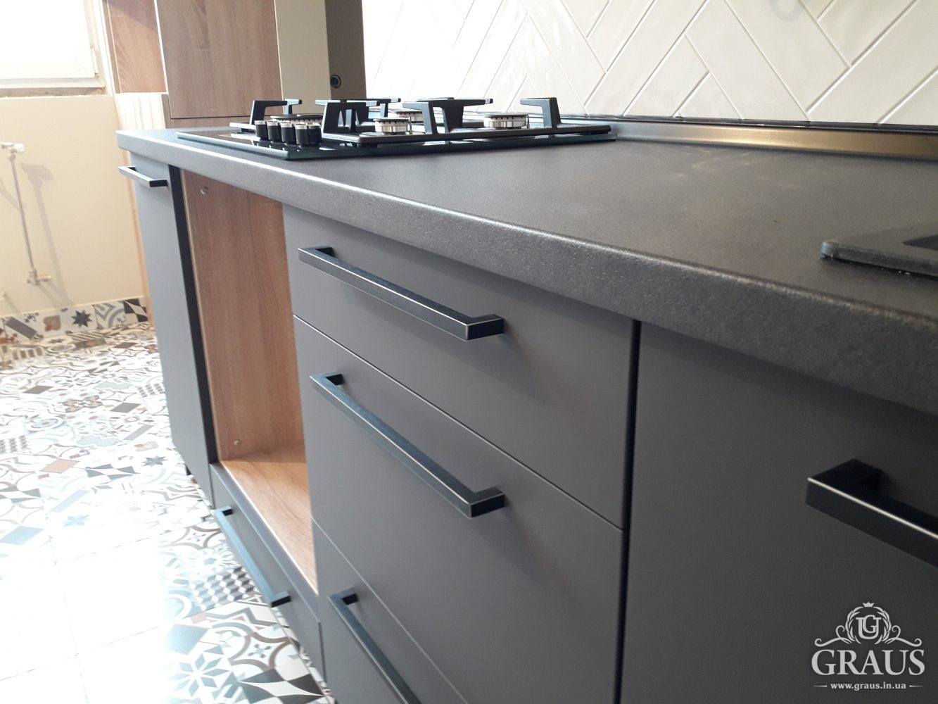 Фасад – МДФ пленочный, фурнитура Blum, Hettich, Muller. Столешница Бучина. Плинтус Rehau.