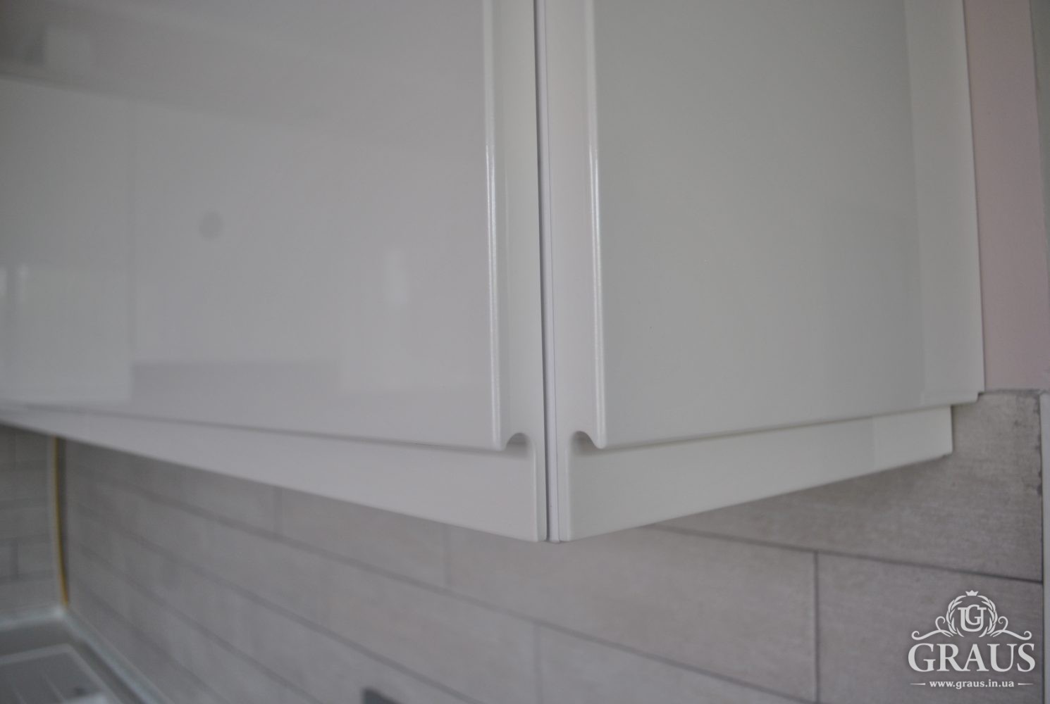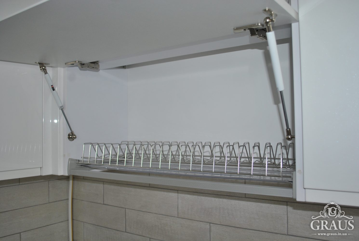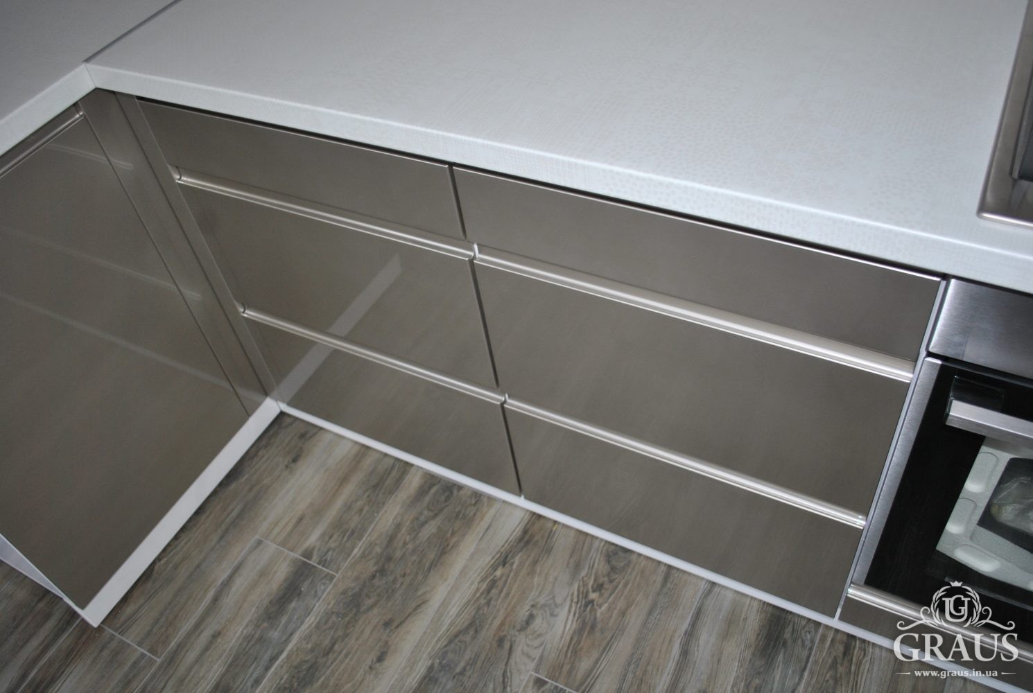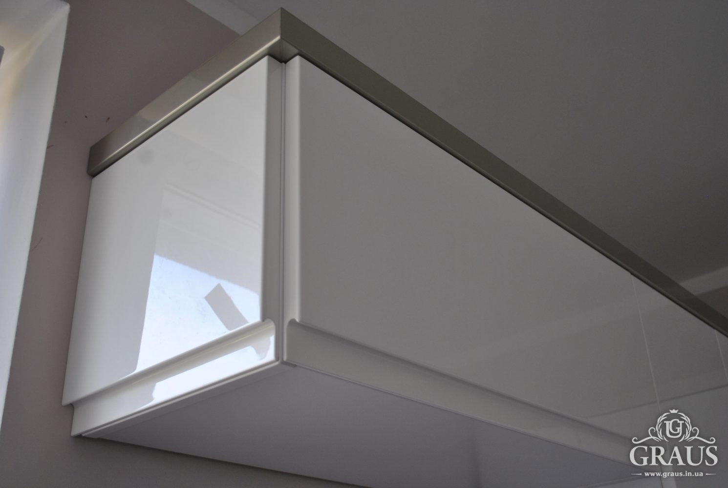 Фасади МДФ глянцеві — автометалік з інтегрованою ручкою, сушка нержавійка та петлі з дотягом. м/п – 450 у.о.