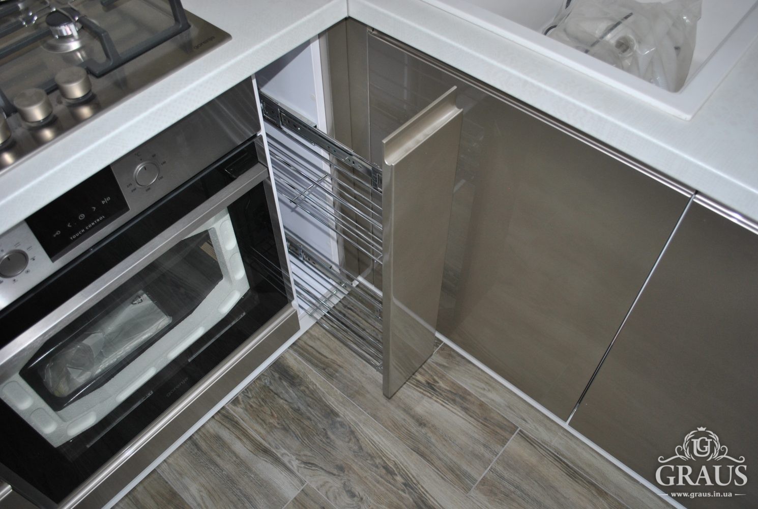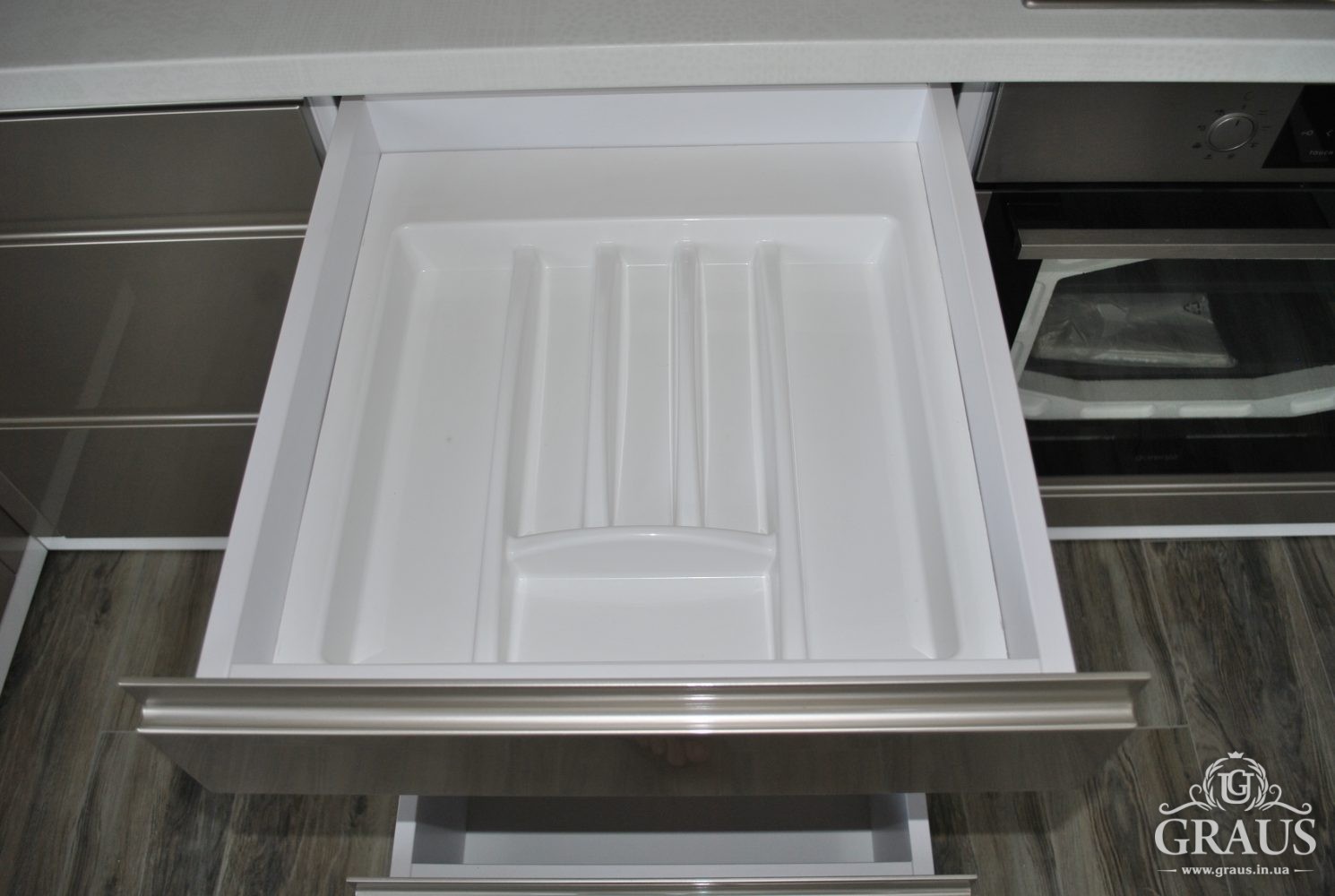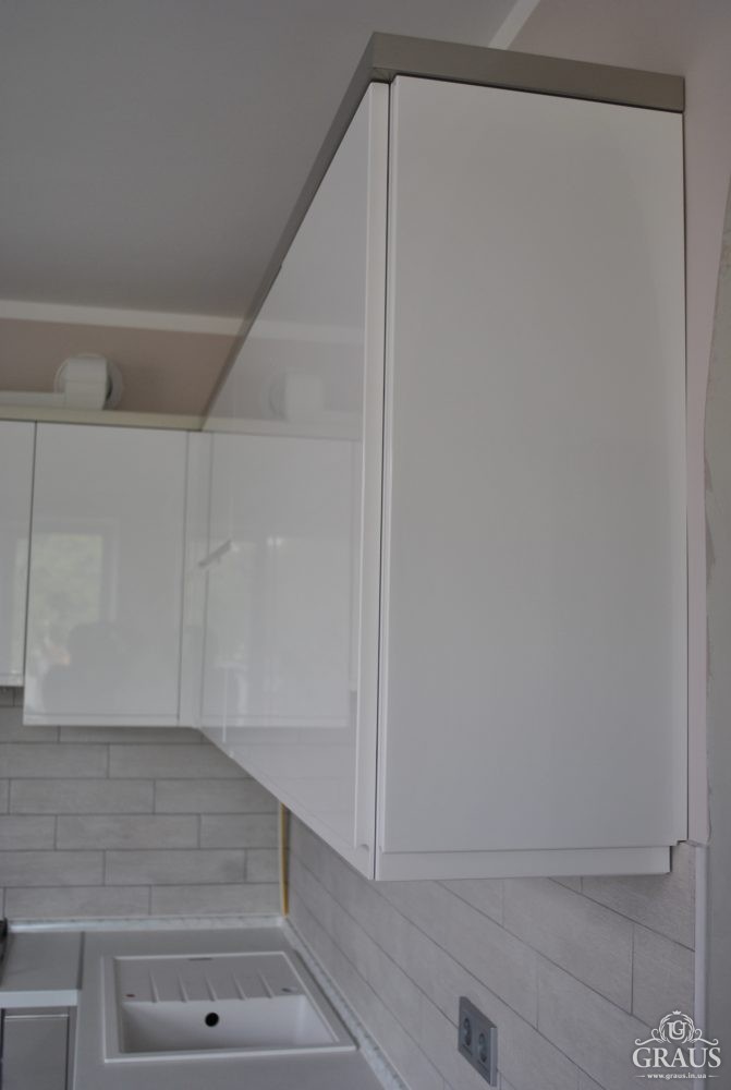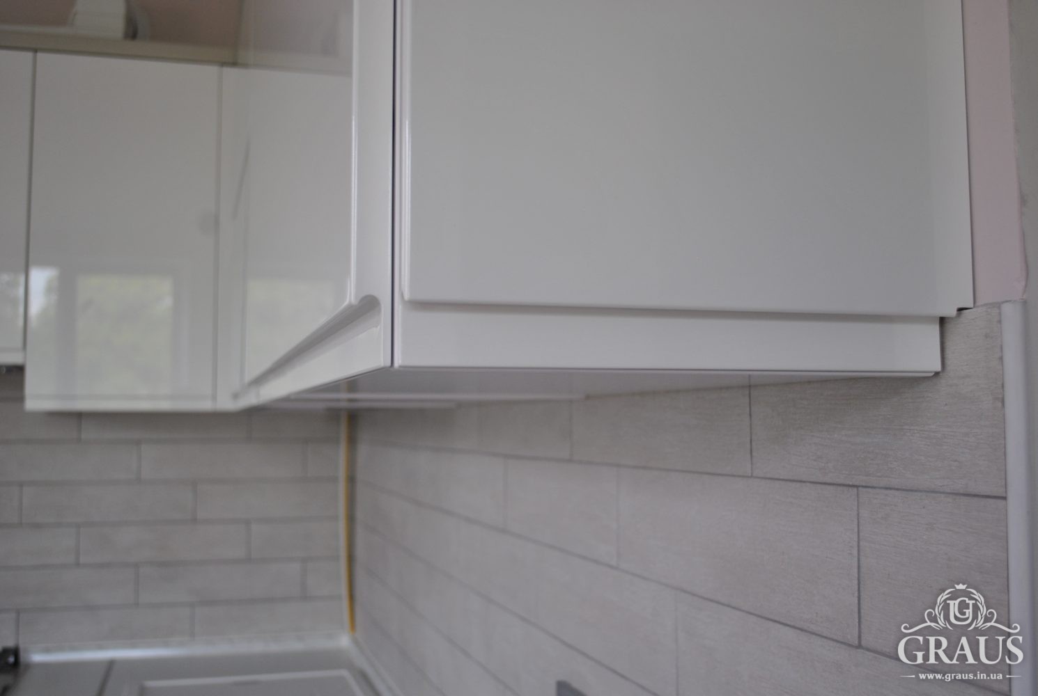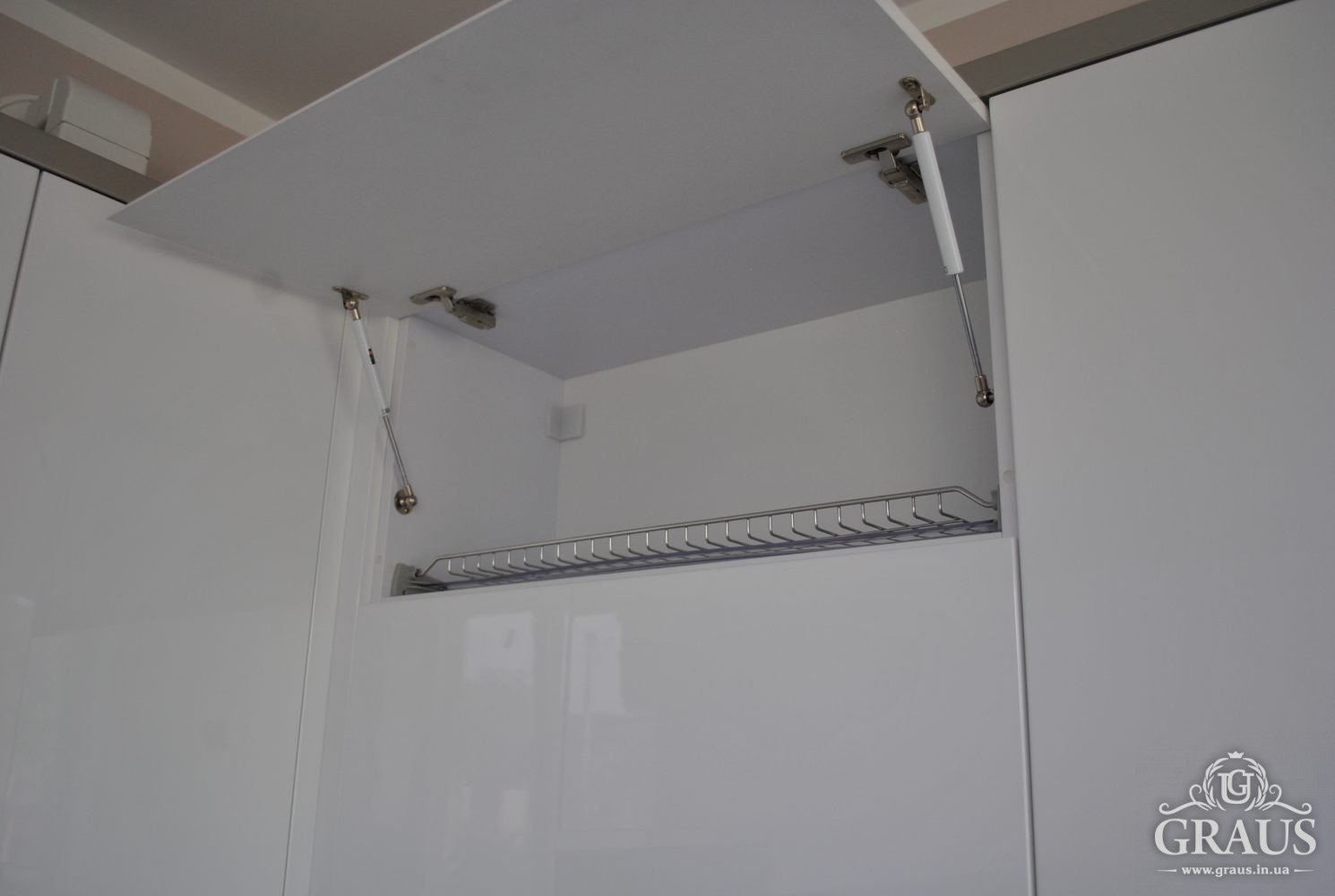 Фасади МДФ глянцеві — автометалік з інтегрованою ручкою, сушка нержавійка та петлі з дотягом. м/п – 450 у.о.