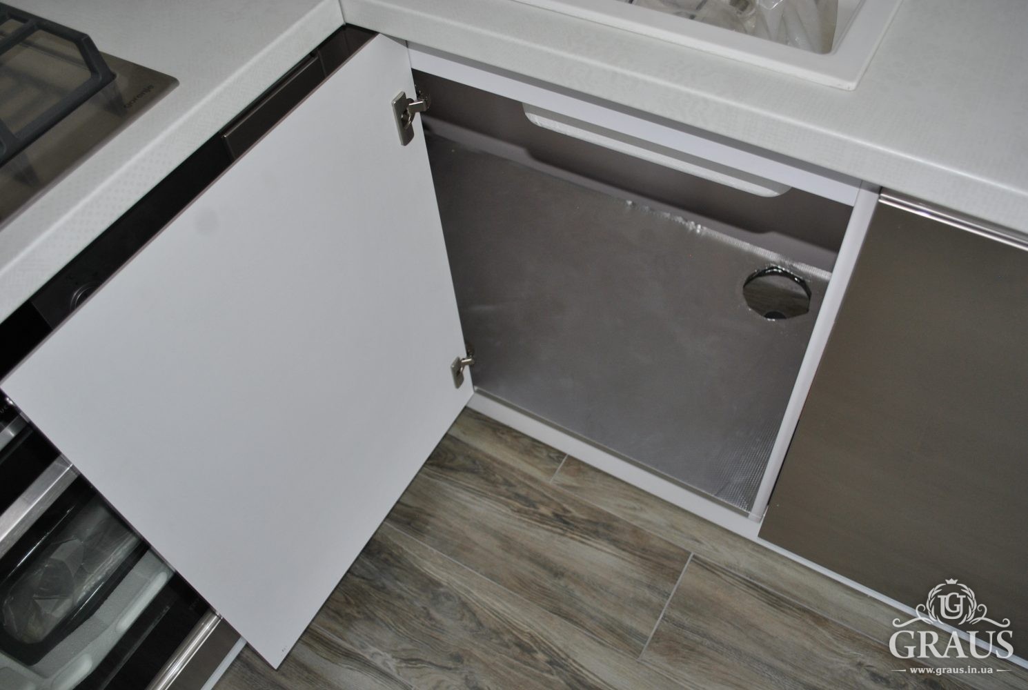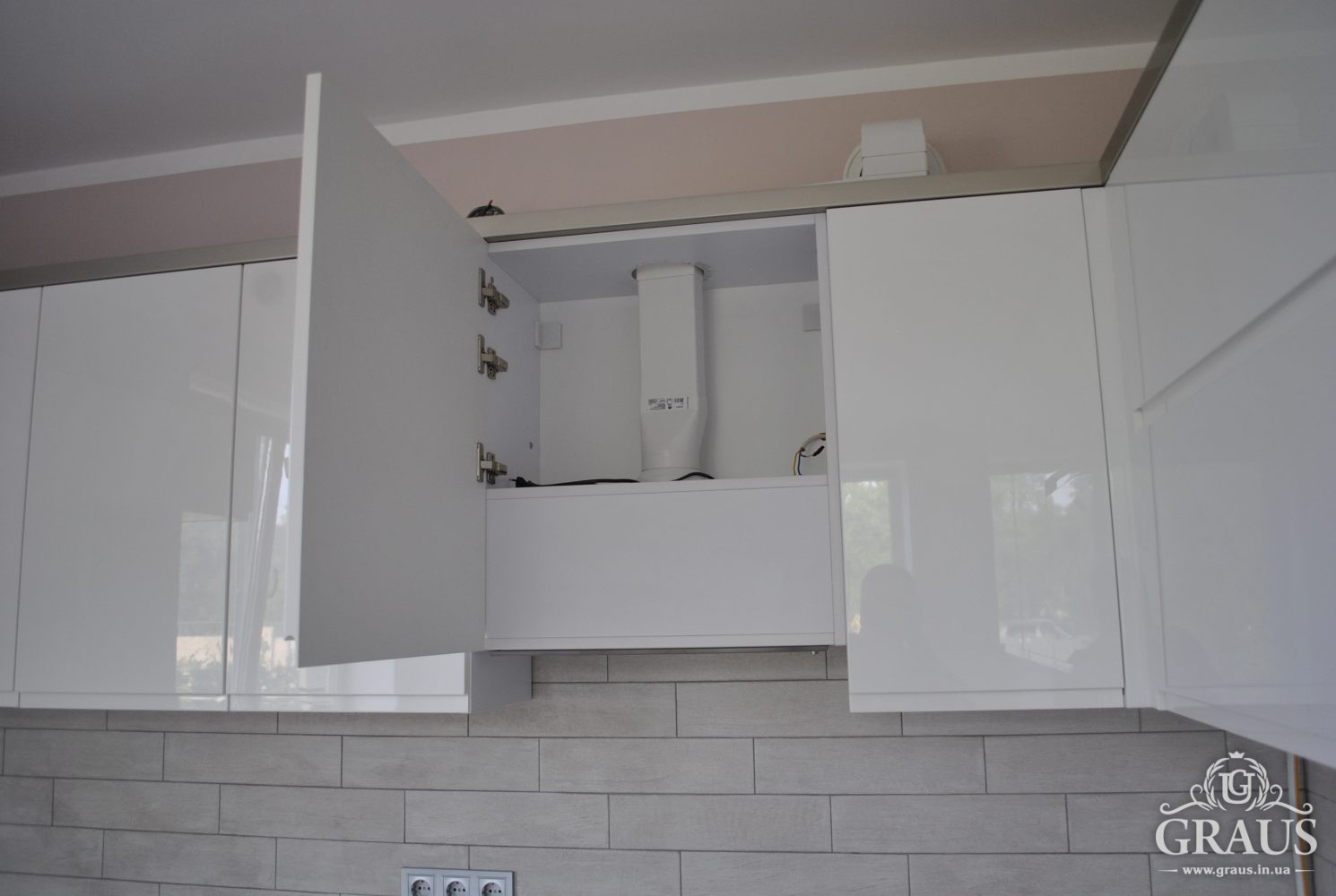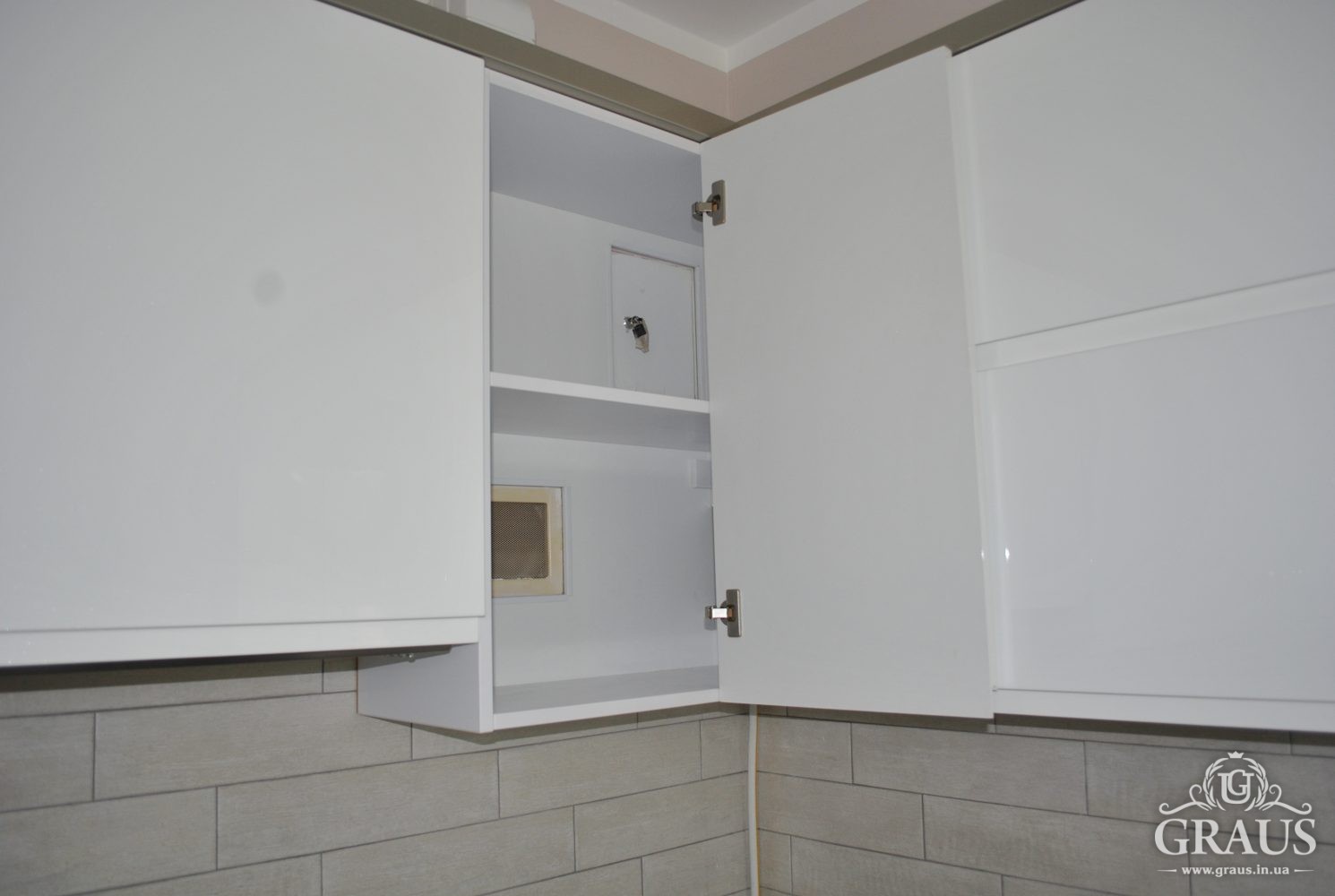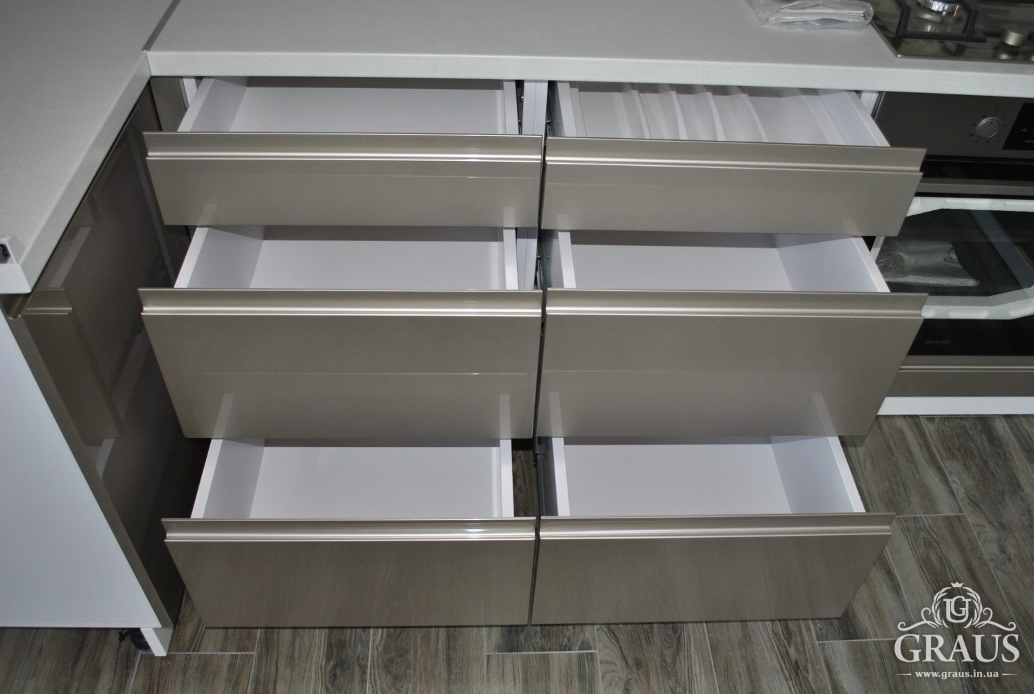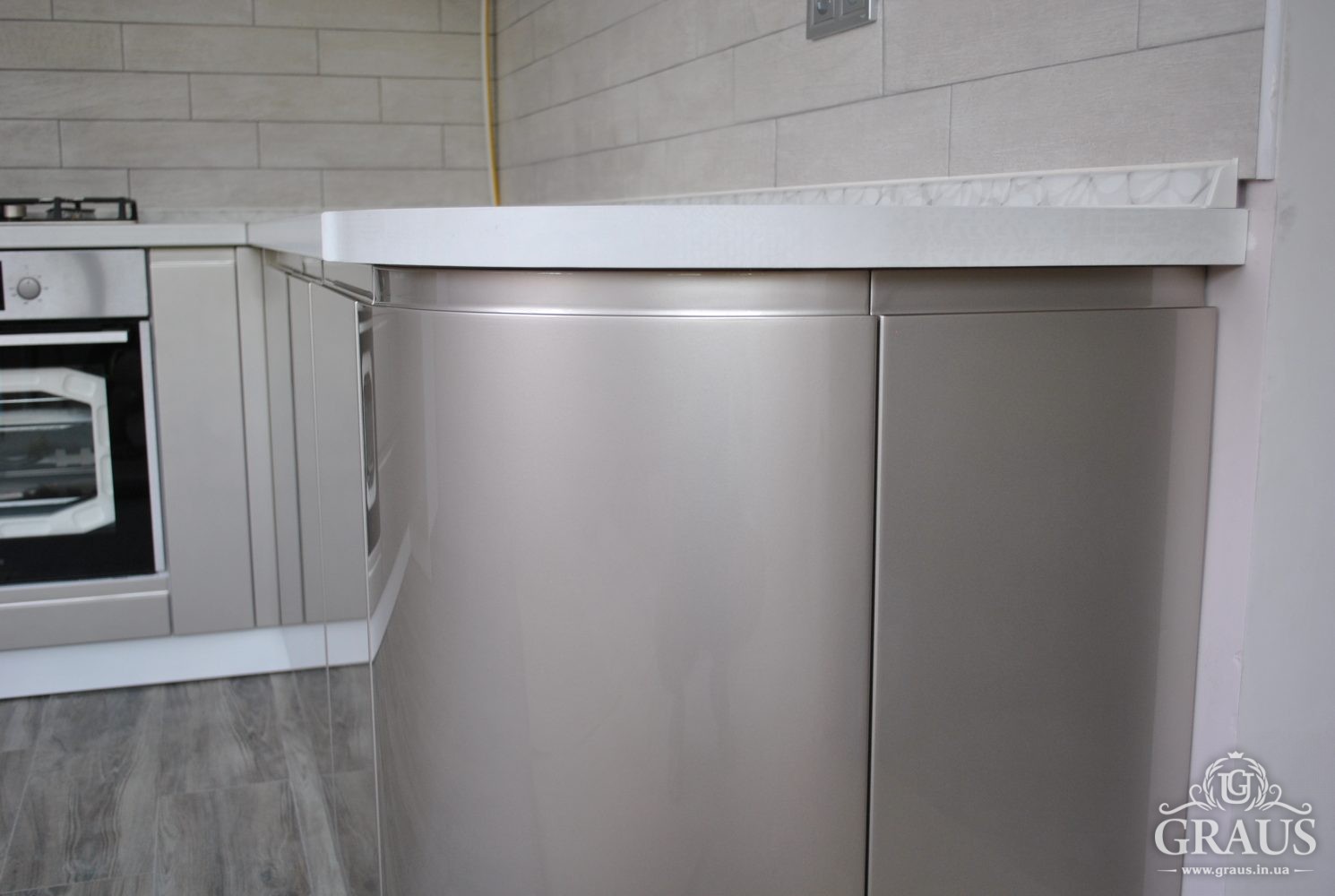 Фасади МДФ глянцеві — автометалік з інтегрованою ручкою, сушка нержавійка та петлі з дотягом. м/п – 450 у.о.