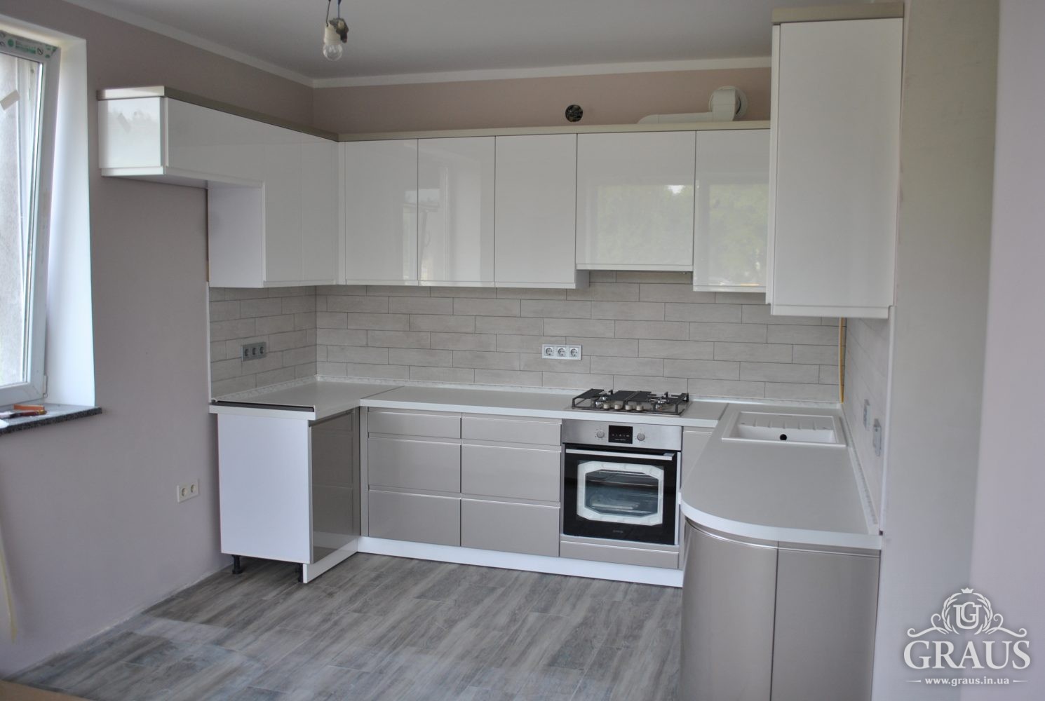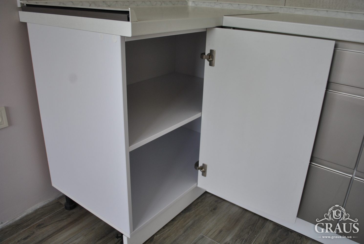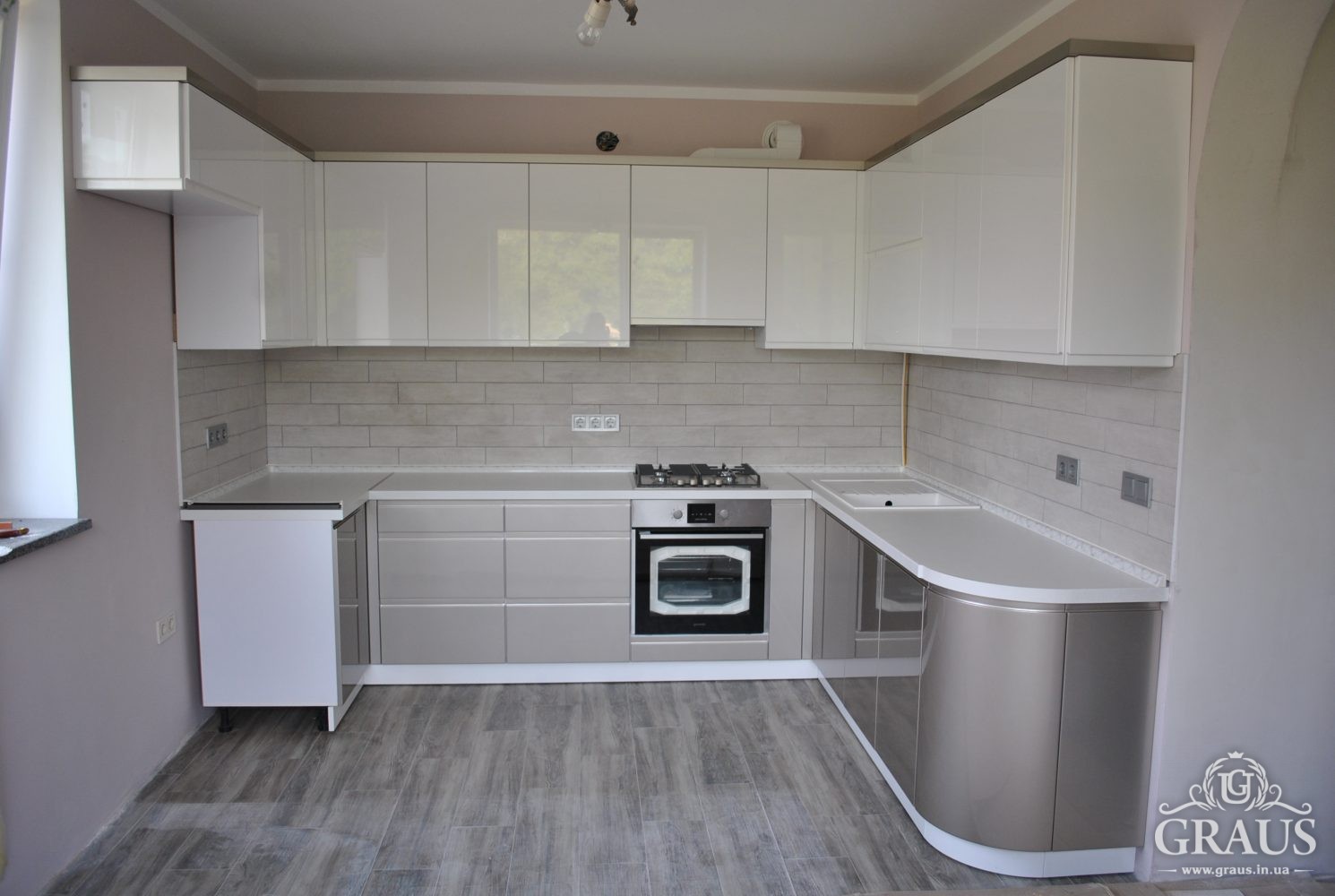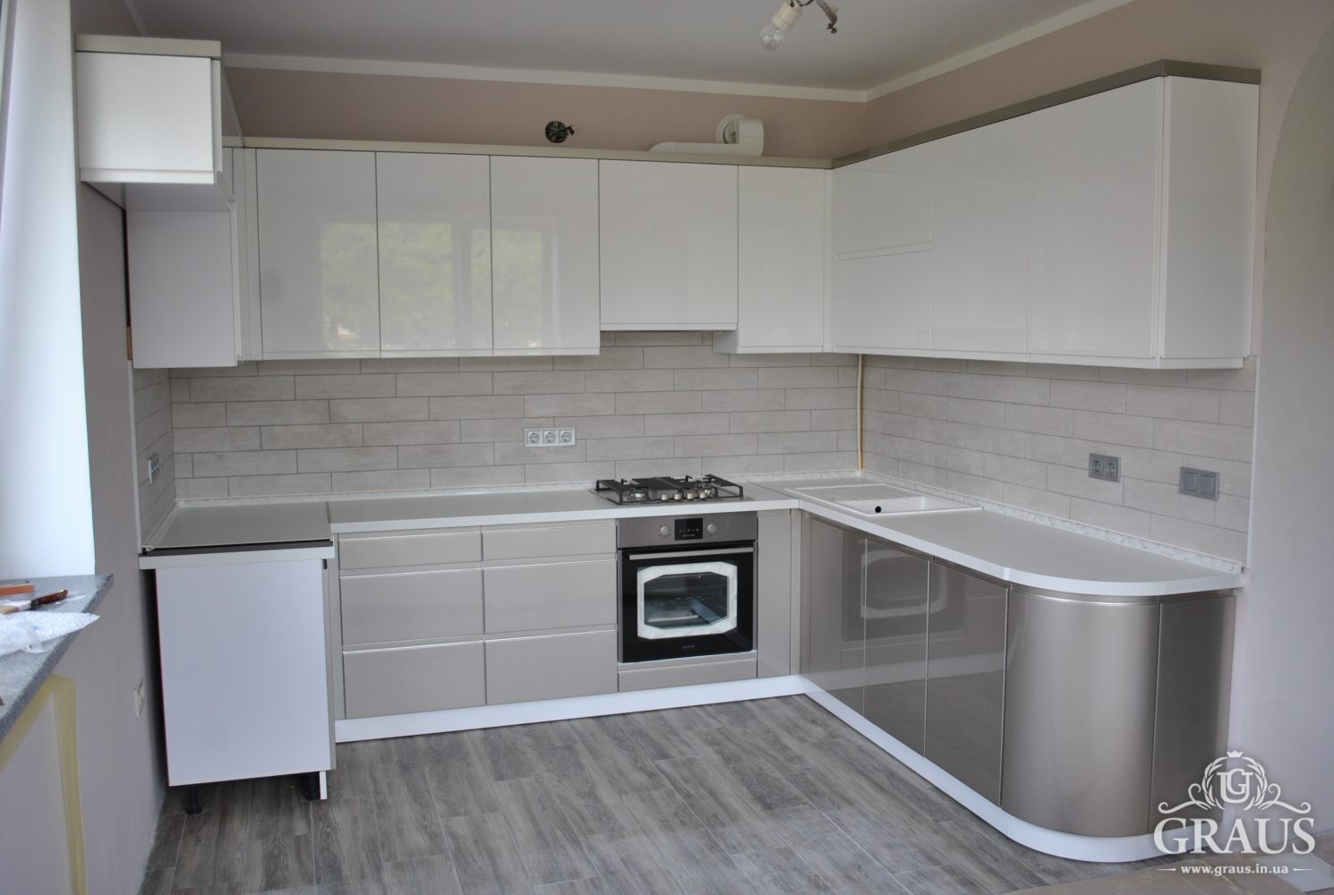Фасади МДФ глянцеві — автометалік з інтегрованою ручкою, сушка нержавійка та петлі з дотягом. м/п – 450 у.о.